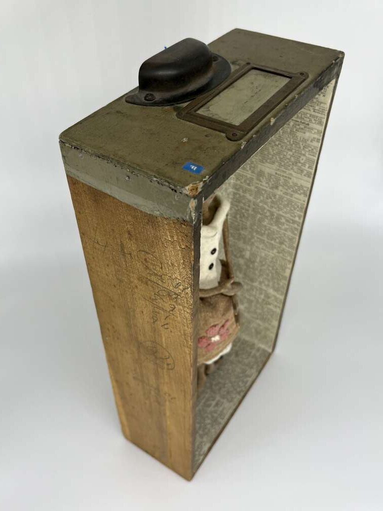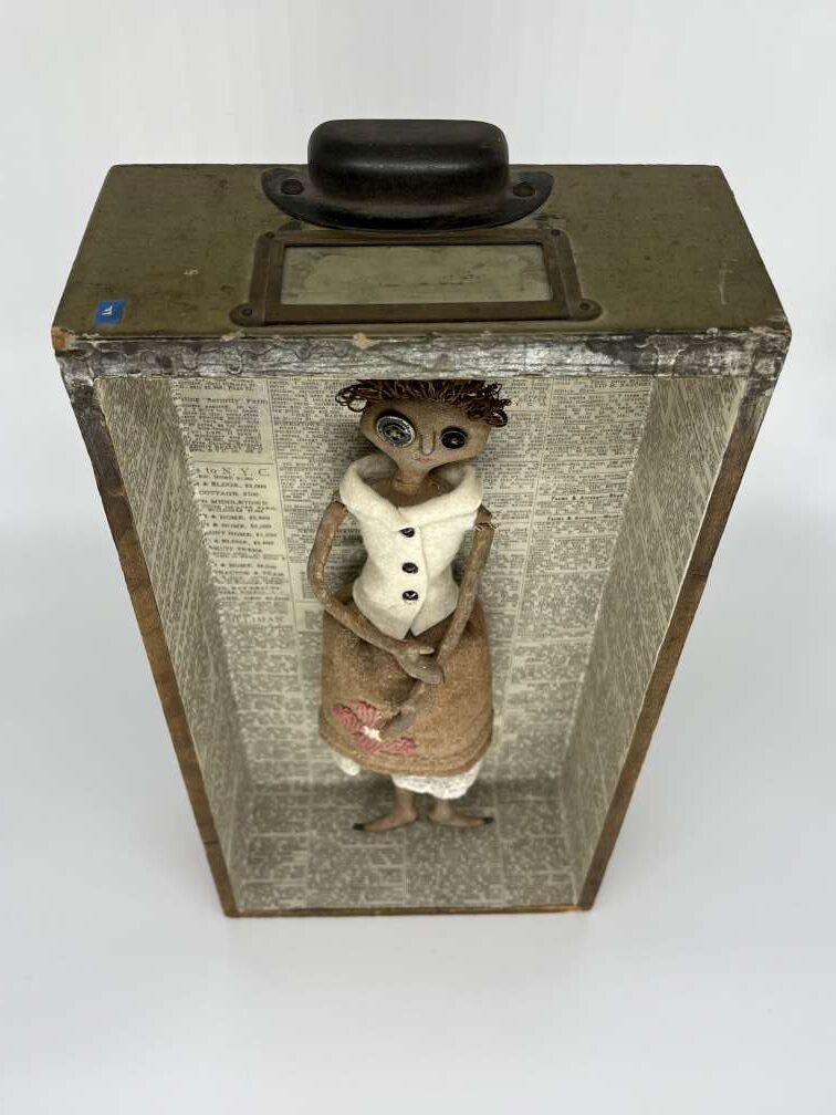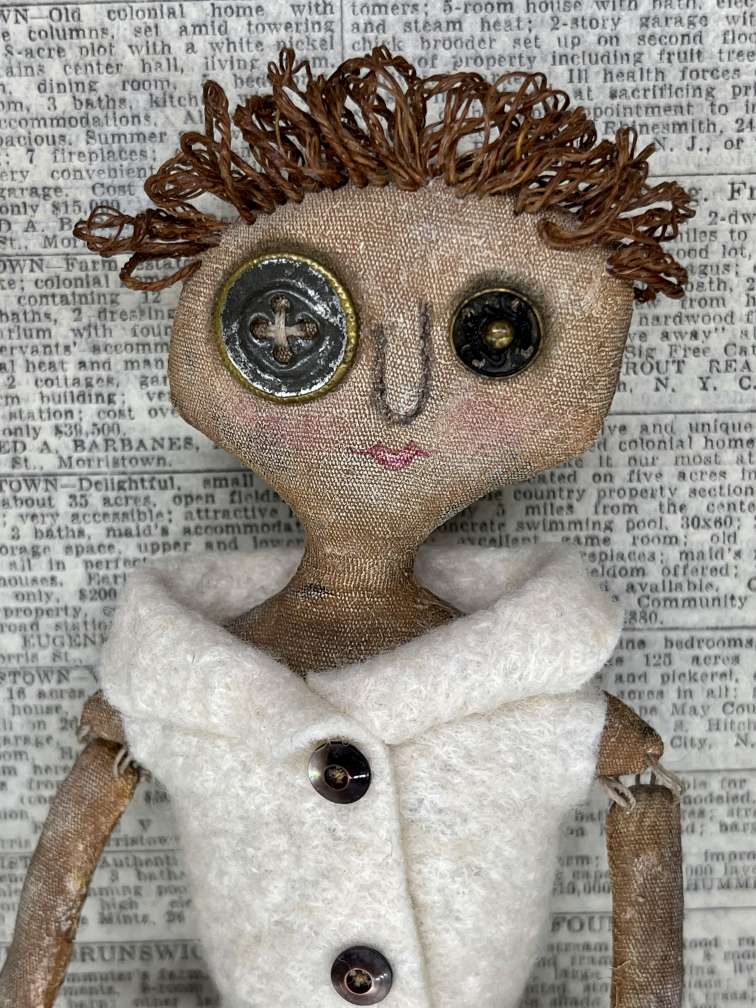 Handmade of cotton, buttons, twine, paint, thread, vintage wool, lace and an antique German grain sack. 14” tall, 7 1/4” wide
